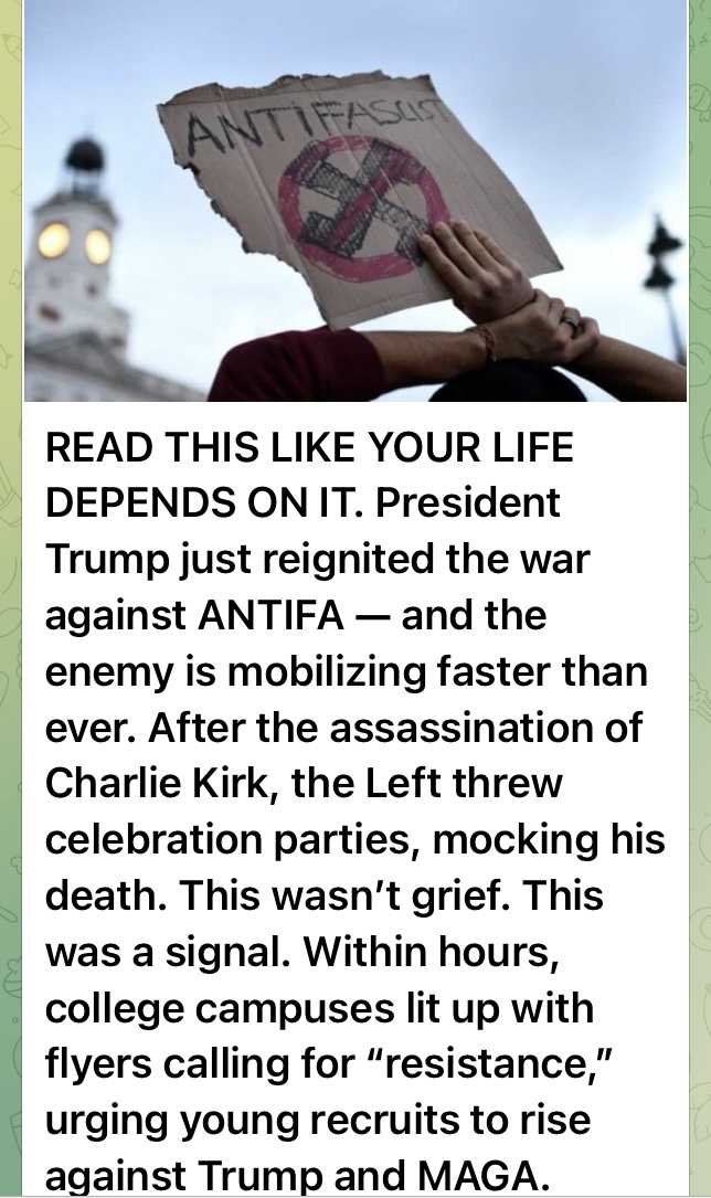 あなたの人生がかかっているとして読んでください。トランプ大統領はANTIFAに対して戦争を仕掛けました。ー そして敵は今までになく動員しています。チャーリー・カークの暗殺後、左派たちは祝いのパーティーをし、彼の死を嘲笑しました。これは悲しみではない。これはシグナルでした。数時間後に大学のキャンパスは "抵抗” を訴えるチラシで点火され、若い学生たちをトランプとMAGAに対して反抗するようけしかけるものでした。