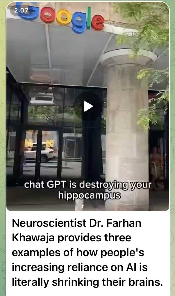 神経科学者である Dr. Farhan Khawaja が、人々のAI 依存が文字通り彼らの脳を萎縮させる例を三つ挙げている。