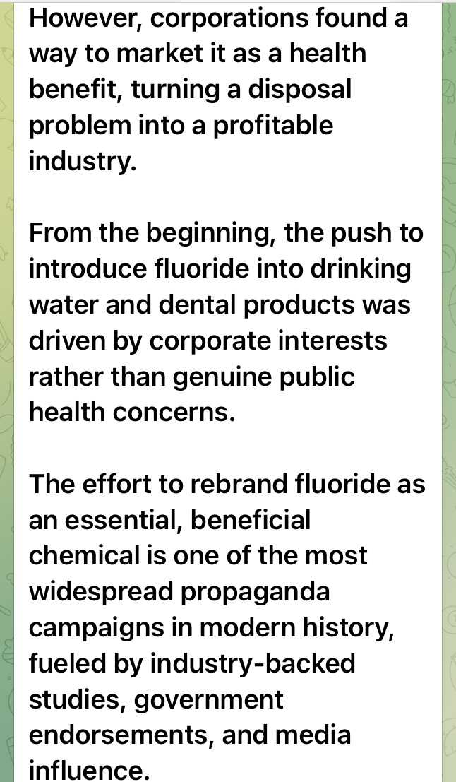 当初から、人々の健康よりも企業の利益になる案として、フッ素を飲み水や歯磨き用製品に入れるよう圧力がかけられた。