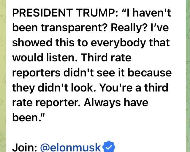 大統領:”私が透明性を欠いて来たと? 本当にそうだろうか? 私はこのことを知りたい者には見せて来た。三流レポーターが知らなかったのは、彼らが見なかったからだ。あなた方は三流レポーターだ、今までもずっとそうだ。”