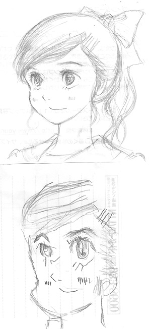 ついでに、以前のもアップしておこう。。私が落書きしていたら、小1の息子がそれ見てその絵を真似して描きたい!! と言い出した。そして描きあがったものを見て本人は「…なんかゴリラみたいになっちゃった…」と言う。旦那は私の絵と比べて見て「オッサンになってる~!」と爆笑。私もすごい笑ったんだけど何かが上手いなーと気に入ったのでした。上が私の絵、で、下が息子の模写した絵。