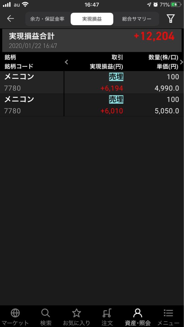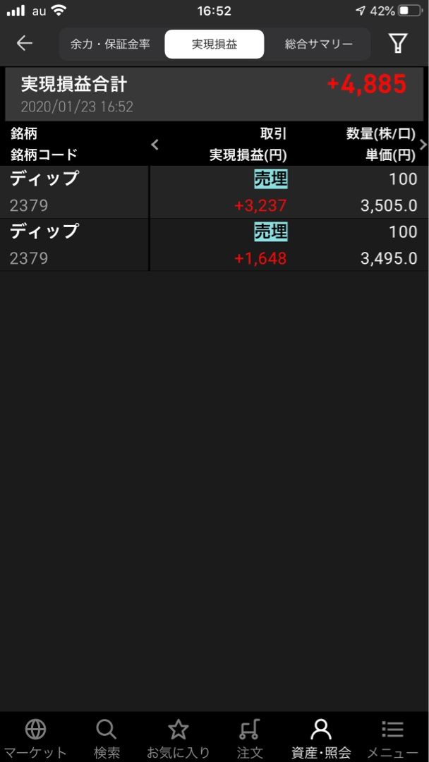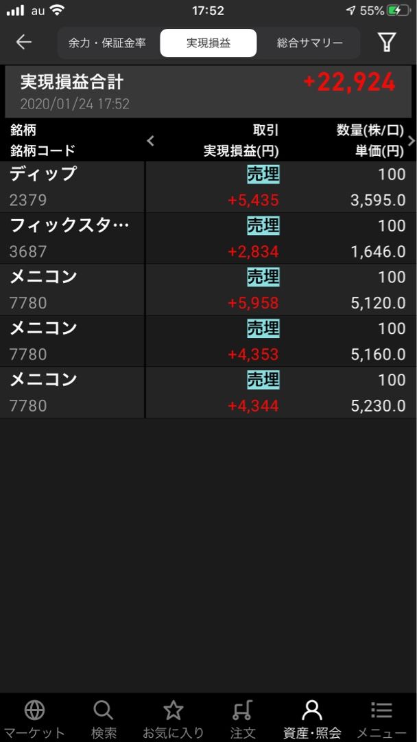 今日は休み のはずだったのに、朝から電話やメール何度もきたり、ちょっと打ち合わせしたいんやけどとか。 出掛けたついでに散髪したり、ヒマやのに忙しない日 で 注文してたメニコン、フィックスターズ、ディップが売れてー またディップ買って、持ち越し、相変わらずの100株のみ。 そう相変わらずでいくつもりだったのに。 メニコン売れて、買って売ってまた買って売って、買って買って あれなんか、ひとつ買ってが多い、しかも高値買いで持ち越し、まあいいかw メニコン、5250くらいのとき珍しく逆指値とか入れてたのが刺さったから混乱したのかねえw 5000円代の株、100株多く買っただけで重くなる、おれの買付余力(貧 まあいいや、月曜もあがってねーってことで ノシ