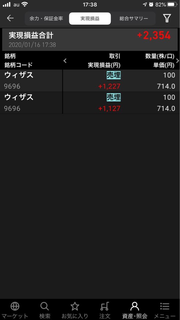 今日は珍しく仕事、年明け2回目w 仕事行く前に適当に注文。 前場 ウィザス売れた 前場終了、13時ごろ仕事終わって帰宅して。 下がってたからウィザス買った あがりそうだったから、ディップ買った 後場終了、持ち越し 今日はこれだけ。 明日は仕事ないからがんばるw あでゅうノシ