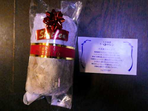 添付された栞には、「西欧諸国ではシュトーレンを11月初めに買い始め家族で食べられております。シュトーレンにはフルーツ&ナッツを3ヶ月ラム酒漬けしたものを練り入れてあります。」小さなパッケージを税込み950円にて購入致しました。美味しく頂けそうです!