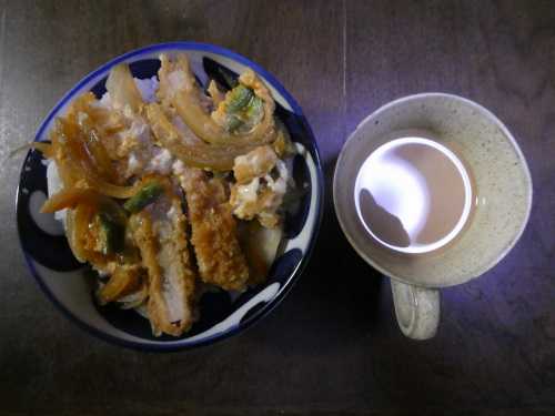 段々と食が細くなって、栄養不足になると懸念して、栄養価の多いカツ丼にしてみました。そうは言いましても、購入したトンカツの1/2を使うだけですので、合わせるタマネギを多くして、鞘インゲンも細かく切って沢山入れ、卵も溶いてフライパンに入れて半熟にすることで、食物繊維にも配慮して積りですが・・余ったトンカツは冷蔵に収納して、後日目先を変えてウースターソースを使ったカツライス等で食する積りです。