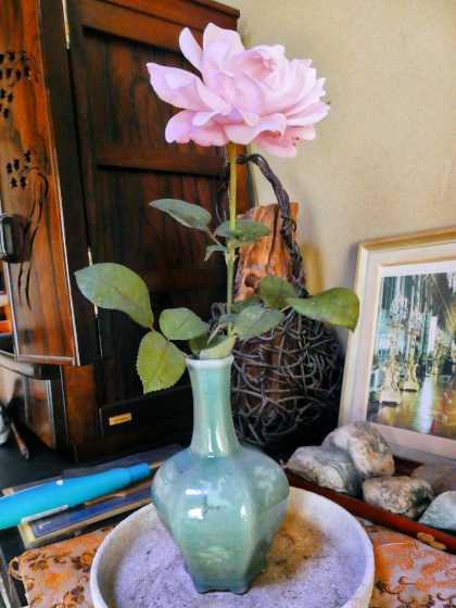 府中郷土の森博物館に行って秋の風情を楽しもうとしたのですが、祭日の翌日は休園日で入れません。仕方なく、その近くにある府中市矢崎町には大東京綜合卸売センターがありますので、其処で買い物をすることにしました。例に依りまして、Tengu印ビーフジャーキー、徳用皮付きさきイカ、Mixed Beans缶詰め、Jelly Beans等買い込んで帰ろうとセンターを歩いていましたら、イベント会場に古物商が開店していました。多分時限的なオープンでもあるのかと覗いていましたら、一輪挿しの花瓶が展示されていました。青磁の魅力ある陶器の様で、値段を聴きますと「500円!」と言いますので即決買って帰ることにしました。今迄はPewterアルミのものが主体でしたので、陶器の一輪挿しも増えますと、花の依っては使い分けが出来るのです。底には「海城」と銘が入っていますが、窯元は不明です。早速、バラ一輪を青磁の花瓶に入れ替えてみました。とても魅力的に見えて、良い買い物をしたと思われました!