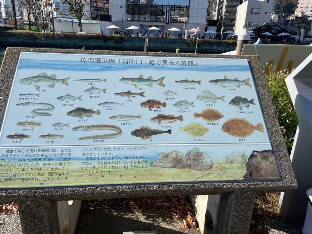 これは新町川で見られる魚達・・・この川は海とつながっているので満潮になると海の魚達が上ってきて橋の上から見られます