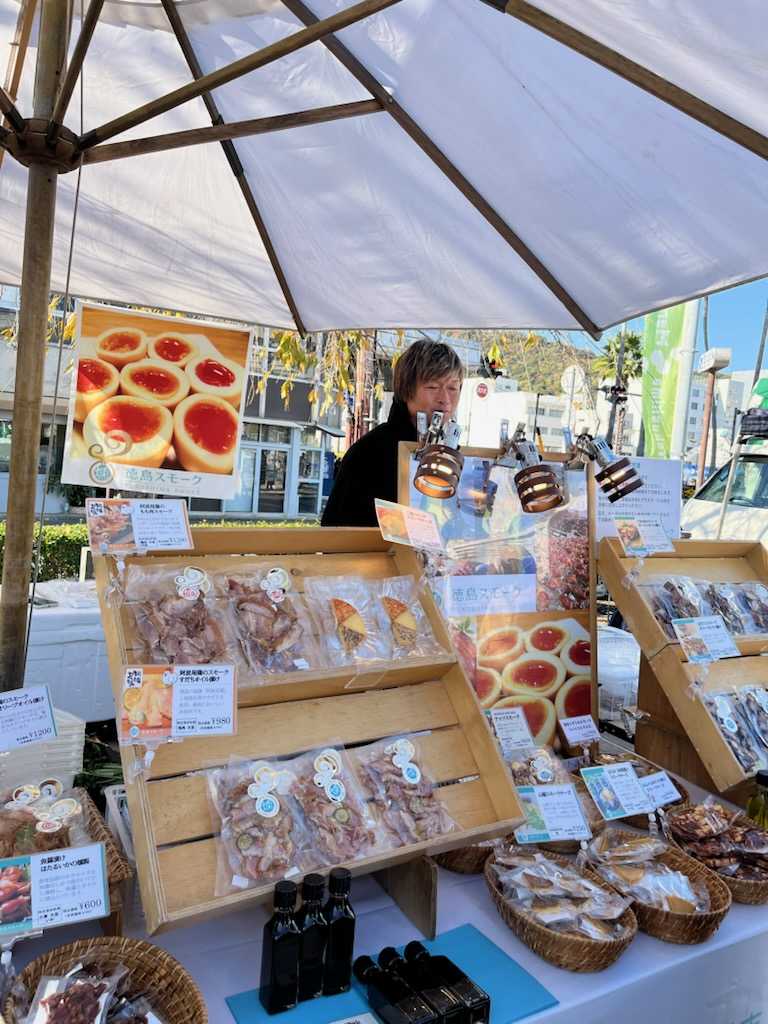 吉祥天贔屓の燻製の店・・・県南部の日和佐から特産の魚やチーズや卵を燻製にして持ってきます