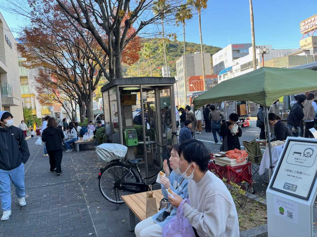 アーケードの真ん中に長くテーブルといすを置いて、買ったものはそこで食べられるようにしているので、そこも大勢