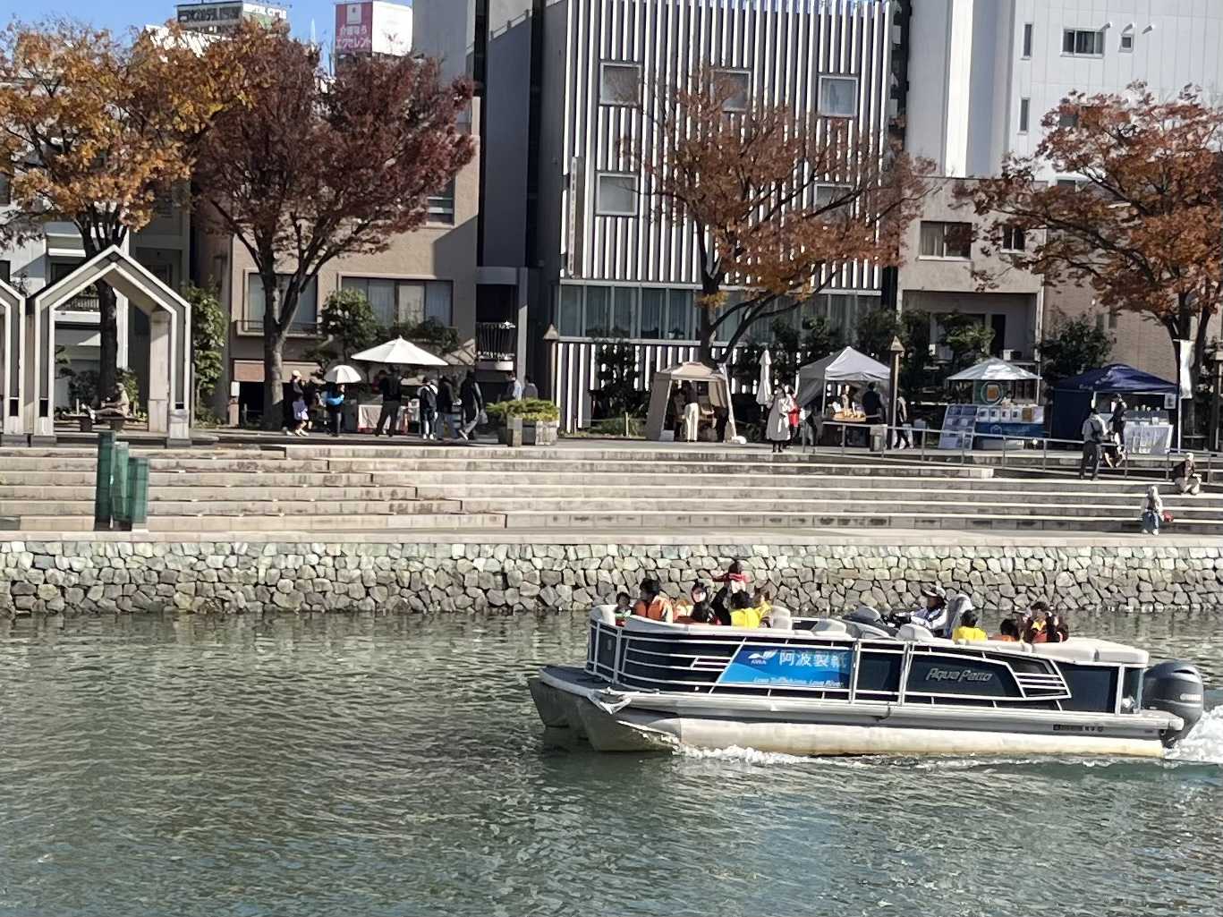 川面に目をやるとひょうたん島クルーズの船が出航したところ