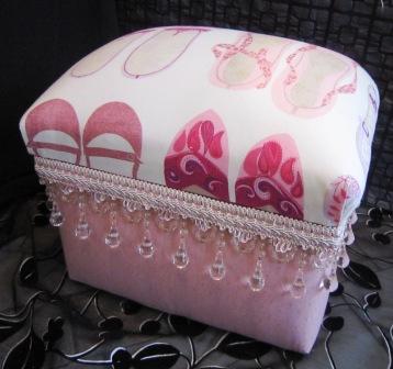 こちらは、最近おなじみになった、トゥインクル・トゥのキスチェ。何人もの方々が、この生地でキスチェナージュを作っていますが本当に十人十色、百人百色、と言っても過言ではありません。いつも新鮮で、ラブリーこちらは、ピンクのガラスフリンジで、一層かわいらしく仕上がりました