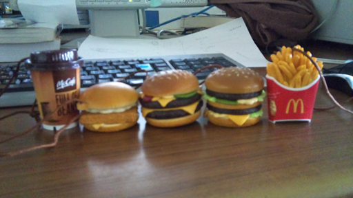 最近、マクドナルドでLセットを頼むと、こういうフィギュア?がもらえます。一度ポテトがダブった以外はかぶらずに集まってきました。あと、アップルパイをゲットできればコンプリートです。shadeで何か作るのに参考になるかなぁと思って一個買ったのが始まりでした。もう、意地になってきました。とはいえ、毎日マクドナルドでは体がもちそうにありません。ポテトが気持ち悪い・・・油って怖いですねぇ・・・