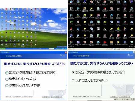 今日は、9時になるのを待ってNECのサポートセンターに電話に、昨日からのパソコントラブルの相談をし、無事元通りに戻すことができた。考えてみれば当然のことなのだが、「トラブルが起ったときはセーフモードで起動」は常識だった。以前使っていた98SE機種はよくトラブったので、セーフモードの起動には慣れていた。しかし、XPに変えてからは、トラブルごとに「システムの復元」で凌いで来た。今回もそれだけが頭にあり、セーフモードのことはすっかり忘れていた。とに角、セーフモードで起動し、システムの復元で、2日前の状態に戻したところ正常に戻ったのだ。セーフモードで起動しただけで元に戻ったのかも知れない。また、昨日トラブった原因が何であったかもはっきりわからないが、いずれにせよ、正常に戻ったことは嬉しい。昨日一日、パソコンが使えず不便したことが嘘のようだ。その後、万一に備えてのデータのバックアップを行ったり、メールの返事などで過ごした。午後は、ベルギー王立美術館展へ行く予定だったが、雨が降って来たので明日に延期した。写真は、ノーマル起動時(左)とセーフモード起動時(右)のデスクトップ画面(上)とシステムの復元のダイアログボックス(下)。風薫る 故障パソコン 復旧すXPでセーフモード起動させたのは初めてだったが、真っ黒い画面一杯に大きなアイコンが並び少しびっくりした。XPの最大の特徴は、トラブった時に、システムの復元で元に戻せることだが、それがセーフモード起動の目的でもあるようだ。