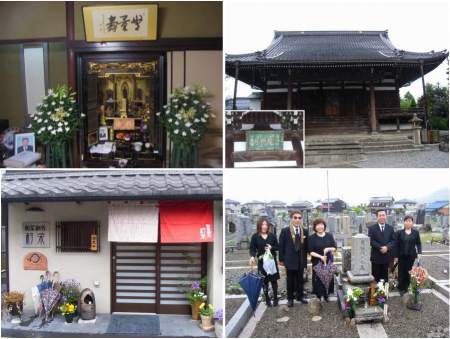 今日は、昨年亡くなった父方の叔父の一周忌法要に参加するため八日市(現東近江市)へ行った。大阪を朝7時に発ち、八日市には9時に到着した。私の弟の一人は東京から前夜に来ており、一人は広島から早朝4時に車で発って来た。法要は、親戚、近所の方、故人の知人など25名が参列し、従弟宅で午前10時半から行われた。1時間に及ぶ丁寧なお経のあと、浄土宗徳円寺住職から説教があったあと、徳円寺本堂でもう一度お経が上げられ、12時40分に終了した。その後、料亭にて昼食が出され、亡叔父を偲びながら従兄弟同士歓談した。滅多に顔を合わせない従兄弟同士だが、暫しの同席でお互いの近況・家族など語り合い和やかなひと時を過ごした。最後にお墓に行き、卒塔婆を立てお参りし、法事が終った。一日中雨が降る生憎の天気だったが、お寺に行くときとお墓に行くときは小止みとなり幸運だった。法事を終え、大阪に帰着したのは8時前だった。写真は、従弟宅の仏壇、徳円寺、料亭村栄の玄関、お墓にて従弟ら家族春時雨 叔父の法事に 日を合はせ