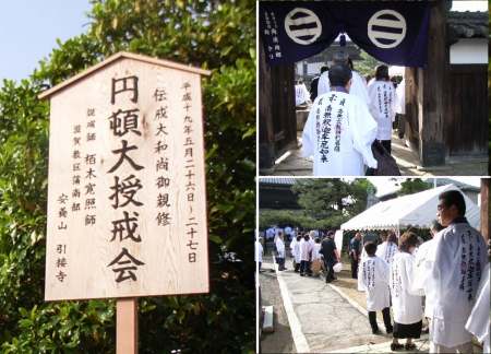 今日は、天台宗の円頓受戒の第一日目。昨日は雨の降りしきる中、夕方大阪を経って新快速で近江八幡、近江鉄道で八日市に来て、アピアで夕食。7時ごろタクシーで旅館に着いた。今朝は、5時過ぎに起き朝食を摂り、6時40分に旅館を出てお寺に向かった。お寺には7時30分集合ということだったが、7時10分に着いた。白い帷子を来た受戒者(以下戒弟という)が次々と集って来る。今回の戒弟は129人とのこと。この円頓受戒は、天台宗開宗1200年を記念して全国で行われるもので、私が檀家となっている寺、安養山引接寺においても、今日と明日の2日間で授戒法会が行われるのである。受戒とは戒を受けるということだが、朝の時点ではあまりよくは知らなかった。得度とまでは行かないまでも、キリスト教における洗礼のようなものだと思っていた。集合して本堂に着座してもなかなか始まらない。始まるまでに精神を整えるためだろうか。8時に1番鐘が鳴る。気持が引き締まる。8時20分に2番鐘が鳴る。まだ何も始まらない。8時45分に3番鐘が鳴りやっと、世話役から日程説明が行われる。9時、正式な開会となり、初めに滋賀教区所長の挨拶があった。9時30分からは導師による受戒勤行儀が始まり、いろいろなお経を唱和する。続いて9時50分から、この受戒のメイン行である三千仏礼拝行が始まる。仏世界には、過去、現在、未来各千の仏様がいて、その仏様に礼拝をするのである。本当は一仏ずつ名前を唱えるのだが、今回の受戒では、導師が20人の仏様の名前を続けて唱え、その後戒弟が「南無阿弥陀仏」と言いながら合掌・礼拝するように簡略化されている。過去、現在、未来の3回に分けて行は行われる。それでも、20人の仏様の名前を読み上げて合掌・礼拝するのに1分ほどかかり、千人の仏様では50回繰り返すことになる。過去千仏への礼拝が終ったのは10時40分だった。20分の休憩の後11時から今度は現在千仏への礼拝が始まる。こうして11時50分、やっと午前の部が終り昼食となった。午後は13時から、説戒という名の講話があり、受戒についての解説をしてもらった。講師は栢木氏。話がうまい。釈迦の生涯、仏教の始まり、伝教大師最澄の生涯から天台宗の歴史までを分かり易く話された。こんな話なら何時間聞いても疲れないと思った。今日の話は前編で後編は明日。14時に話が終り20分休憩の後、14時20分から未来千仏への礼拝。15時10分長い礼拝が終る。これで3千仏に礼拝したことになるのだ。休憩後、15時40分から、引接寺住職により、戒弟の先祖への回向・礼拝が行われこちらも130人の戒弟家族の先祖ごとに「南無阿弥陀仏」を唱えながら合掌・礼拝を繰り返す。16時30分、やっと一日目が終る。ときどきは足を崩したとは言え、殆ど正座で坐っていたので足も痛いし腰も痛くなった。若いものにはあまり苦ではないかもしれないが年寄りには重労働だ。明日もう一日頑張ろう。写真は、境内撮影禁止だったので、何も写せなかった。入場までに撮影した分のみを示す。読経にも 上手下手あり 仏法僧仏法僧=鳥の名