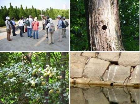 今日は、大阪城早朝探鳥会の日。家を6時半に出て森の宮の噴水前の集合場所に行った。今日の参加者は15名ほどでいつもより少し多かったが、鳥の数は少なかった。今は一番少ない時季だそうだ。今日見た鳥は、カワウ、ササゴイ、ゴイサギ、キジバト、コゲラ、ツバメ、ヒヨドリ、シジュウカラ、スズメ、ムクドリ、ハシボソガラス、ハシブトガラスの12種。コゲラは先日巣立ちしてばかりで、巣は空だったが付近の枝に来ているのが見られた。シジュウカラはツピーツピーツピーとと鳴きながら梢を飛び回っていた。ササゴイは内堀にいた。ゴイサギも内堀にいてじっとしていた。目玉の周りがオレンジ色できれい。(シャッターチャンスだったがカメラの電池切れで撮影できなかった)その他、植物で面白いものを見た。ムシコブというものでいろいろな種類があるそうだ。木の実のような形だが、虫が卵を産んだあとを植物が覆ってこぶを作っているのだ。中には虫の卵か幼虫がいるそうだ。写真は、講師の元山裕康氏から今日の説明を受ける参加者、コゲラの巣穴、ムシコブ(イスノキ)、ササゴイ。四十雀 好き好き好きと 鳴き交す