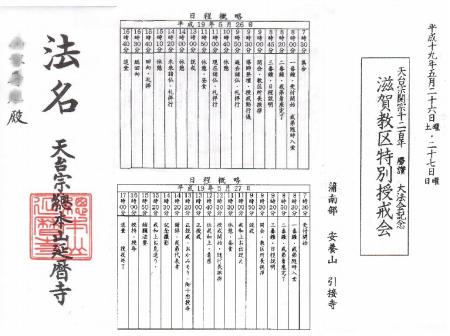 今日は円頓受戒第2日目すなわち最終日。いよいよ戒を受ける日だ。昨日と同じように7時半集合ということで、定時少し前に到着した。7時半に本堂に坐る。次第に戒弟が集りほぼ全員が揃うが、主催者側から何も話はない。戒弟同士話をしながらただ時間が過ぎるのを待っている。8時半になってやっと一番鐘。まだ何の説明もない。沈思黙考でもせよということか。次第に戒弟の間からもしびれを切らし早く始めてくれという声が出始める。8時50分に2番鐘。やっと世話人が顔を見せ、もうしばらくお待ち下さい、とのこと。9時20分に3番鐘が鳴り、世話人から今日の日程説明を受ける。今日は、午前中は昨日の説戒の続きの講話。続いて比叡山からの伝戒和上をお迎え、午後、いよいよ受戒の儀式だそうだ。9時50分から、説戒が始まる。今日の話は、仏教における戒とは何か、戒を受けるとはどういうことかを説くもの。簡単に言えば国の法規制のようなものだそうだ。元々は鑑真和上が日本に伝えたもの。具足戒と言い元々インドで作られ250の戒があったが、国柄や気候に合うように作りかえられたものを円頓戒というのだ。このうち今回受けるのは3つの戒。簡単に言うと、 1.悪いことをしない。 2.よいことをする。 3.人のためになることをする。続いて、受戒の儀式の説明があった。剃刀の儀、仏舎利拝頂、念持仏拝受、法名拝受などがあるとのこと。11時に説戒が終り、戒弟全員が山門からの道の両側に出て、伝戒和上一行を出迎えた。その後、12時20分まで休憩となり昼食を摂った。12時過ぎに本堂に着座した。12時30分随行長の挨拶のあと、伝戒和上が内陣に上がり受戒の儀式が始まった。12の式目があり一つ一つ説明を受けながら言われる通りにお経を唱えたり礼拝をしたりを繰り返す。6番目の式目で、お剃刀、仏舎利拝頂、念持仏拝受があり一人ひとり和上から直接受ける(本当はお釈迦様から受けるのだ)。続いて7番の式目に移り戒弟は戒を守ることの誓いをする(和上から「・・・ことをよく保つや否や」と問われるので「よく保つ」と答える)。ここで鐘が3回鳴り、仏種が身体の中に入る。式目はさらに進み最後の12番で法名を受ける。続いて戒弟から謝辞が述べられ、14時30分受戒の儀式は終った。このあと記念撮影し、15時20分伝戒和上一行を見送り、休憩の後、15時40分から引接寺住職による結願法要が行われ、16時過ぎ、すべての儀式は終了した。疲れたが、なんとなく清清しい気持になった。受戒とはどんなものか分からずに参加したが、精神を鍛えるのに少しは役立ったように思う。とに角2日間は、日ごろの生活からまったく遮断された修行一筋の生活だった。パソコンもパズルもその他のこともまったく忘れて過ごした2日間だった。写真は、2日間の日程概略表と法名の入った奉書。戒を受く お堂吹き抜く 青葉風