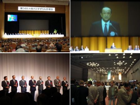 今日は、会社のOB会の総会の日。10時に家を出て10時40分に大阪国際会議場に着いた。受付を済ませて6階の会議場に着くとすぐにビデオ上映が始まった。会社の現状がわかりやすくまとめられている。ビデオが終ると物故者への黙祷、OB会会長の挨拶、会社社長の来賓挨拶、会務報告、会計報告、役員改選と続き、最後に白寿、米寿などの慶祝報告で12時過ぎに閉会となった。続いて会場を3階の大広間に移し懇親会である。懇親会は、会社役員、OB会会長らによる乾杯の後、パーティ形式で飲食をしながら歓談するもの。各自懐かしい顔を見つけて現況を語り合ったり、昔の思い出を話したりしながら、楽しいひとときを過ごした。私は100人以上の人に会って挨拶を交わすことができた。こうして14時20分万歳三唱を以って再会となった。写真は総会の模様、OB会会長の挨拶、会社役員らによる乾杯音頭、歓談風景。OB会 話の弾む 薄暑かな