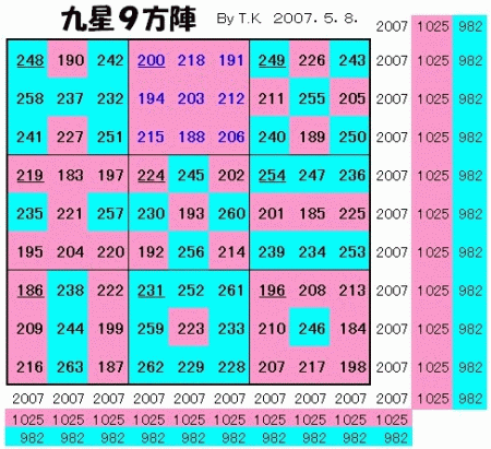 今日は、午後一時回生病院へ胃の診察に行ったほかは、R氏から依頼されたパズルの検討に時間を費やした。胃はときどきもたれるような感じがあるので、定期的に診察を受けている。来月胃カメラの予定。パズルの問題は2つあり、一つの問題はまだ完全な解が得られていないが、もう一つの問題については、満足すべき解が得られた。その解を下に示す。名前は、R氏は単に9星陣と名づけたが、星陣というのは5星陣、6星陣など星型の陣をいうので、私は、九星9方陣と呼びたい。九星というのは、陰陽道で九つの星に五行と方位を組合せ、これを用いて吉凶を判断するもの。 二黒土星 九紫火星 四緑木犀 七赤金星 五黄土星 三碧木星 六白金星 一白水星 八白土星色や星が重複しているので面白いとは思わないが、それぞれが方位を現わすこと、数字が3方陣の形に並んでいることは興味深い。作成した九星9方陣を下に示す。パソコンが 方陣作る 夏の夜この九星9方陣の特徴は下記の通り。1.3×3のマスの中にある赤地の数は、3方陣になっている。(左上には2個)2.上中央の3×3のマスは3方陣になっていて、縦、横、斜め計8方向とも609になっている。3.183から263までの81の連続数を用いた9方陣で定和は縦、横、斜め計20方向とも2007になっている。4.赤地の部分だけと見れば5数和が縦、横、斜め計20方向とも1025になっている。5.青地の部分だけと見れば5数和が縦、横、斜め計20方向とも1025になっている。6.次にここが九星たる所以で、R氏の着想によるものだが、3×3のマスの同じ場所にある9数和がすべて2007になっている。例えば、左上(二黒土星)の場所(下線を引いているところ)の9数和も2007になる。7.同様のことは、赤地だけを取り出しても言え、同じ場所にある5数和がすべて1025になっている。8.同様に、青地だけの場合も、同じ場所にある4数和がすべて982になっている。9.さらに、3×3のマスの中にある9数の和も3方陣になっている。但し、斜めの一方は成立しない。10.3×3のマスの中の赤地の数の和も3方陣になっている。(下図左参照)11.3×3のマスの中の青地の数の和も3方陣になっている。但し、斜めの一方は成立いsない。(下図右参照)