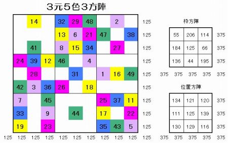 今日は、午前中はゴルフの打ちっ放しに行き、帰宅後はパズル原稿の作成などをした。パズルはいろいろ研究しているが、そのうち力石氏から出題された問題が「3元5色3方陣」。3方陣の方陣内方陣であって、枠方陣、位置方陣がともに成立し、しかも縦、横、斜めに5色が揃う方陣を作れというもの。5月8日の本日記で紹介した「九星9方陣」に比べ格段に難しく、5月初め以来ほぼ一ヶ月パソコンを走らせているが、まだ満足すべき解は得られていない。そこで少し不満は残るが、これまでに得られたうちで一番きれいな解を発表することにした。それを下記に示す。パズル解け 稿送付せる 五月尽この3元5色3方陣の特徴:力石氏によると、3元とは、1.方陣内方陣、2.枠方陣、3位置方陣が成立すること、5色とは下記3の特徴を意味する。1. 3×3のマスの中にある色付マスの個数は、3方陣になっている。(上段は2,9,4個、中段は、7,5,3個、下段は6,1,8個)2. 1から49までの整数のうち10の倍数を除く45数を用いた方陣で定和は縦、横、斜め計20方向とも125。3. 各行、各列、両斜めの10位の数はすべて異なる。即ち、これが5色たる所以であり、10位の数が同じマスに同じ色、異なるマスに異なる色を塗れば、各行、各列、両斜めのすべてのラインに5色が揃う。4. 3×3のマスの中の数の和を要素とする3×3を作ると、定和375の3方陣になっている(枠方陣)。5. 次に、3×3のマスの同じ位置にある5数和を要素とする3×3を作ると、定和375の3方陣になっている(位置方陣)。例えば、左上だけをとると、32+24+46+7+25=134なおこの方陣が完全なものではないというのは、1から45までの45数ではなく、1から49までのうち10の倍数を除く45数を使っているからである。1~45までの45数を使った完全解はまだ見つかっていない。そろそろ諦めたいと思う。アクセス数77777間近!!当ブログのアクセス数が、現在、77729となっている。今晩から明日未明にかけて記念すべき77777を超えると予想される。どなたが77777番目のアクセス者になられるだろうか。77777番に当られた方は、是非コメント欄にご連絡いただきたい。