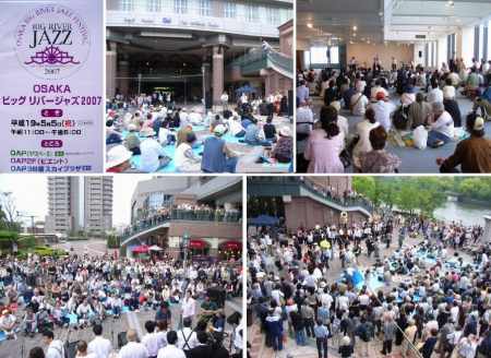 今日は、午前中はテレビを見たりして過ごし、午後は、OAPで開催されたビッグリバー・ジャズ2007を楽しんだ。ビッグリバー・ジャズは毎年5月にOAPで行われていて今年で11回目。参加したいと思っていたのだが、昨年までは5月の第2日曜日に行われていたため、この日にパズルの例会がある私は参加することができなかった。今年からはこどもの日に開催されることになったので、参加出来るようになった。会場は、OAPの広場(室内)とOAP38階(室内)で8つのセミプロのジャズバンドによる演奏が行われた。私は、2つの会場を行ったり来たりしながら、12時半から17時まで、文字通りジャズ漬けになっていた。集った人達は毎年来ている常連も多く、みんな軽やかなサウンドと心地よいリズムに酔い痴れていた。司会者が尋ねていたが、大阪だけでなく、兵庫、京都、奈良、滋賀、和歌山から来た人もたくさんいた。演奏は、1バンド45分で、最後のエンディングでは、8つのバンド総出演による合同で、「聖者が町にやってくる」が演奏された。ソロセクションでは普通なら単独の楽器が演奏されるが、この場合は、4つのバンジョーであったり、3つのホルンであったり、2セットのドラムであったりして滅多に見られない演奏を聴くことができた。演奏者の前ではダンスを踊る客が次々と出て来て、演奏者と一体となって楽しんでいた。写真は、会場の模様。上右は38階の室内会場。天気がよかったので、室外会場の方が観客が多かった。下右はエンディングの模様。晩春の 大川端に ジャズ響く写真は、ニューオリンズ・グローリーランド・ジャズバンド、ハッピーゴーラッキー、マホガニーホール・ストンバーズ、ニューオリンズ・レッドビーンズハッピーゴーラッキーは女性アカペラジャズグループ。歯切れのよいリズムセクションが素晴らしい。写真は、ニューオリンズ・ラルカルズ+ジェフ・ブル、ロイヤルフラッシュ・ジャズバンド、早稲田大学ニューオリンズジャズクラブ、姫路キャッスルジャズバンド早稲田大ジャズクラブは創部50周年の記念の年。わざわざ東京から参加。