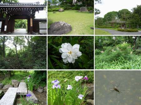 今日は緑懇会の例会日で、京都御苑の見学だった。梅雨の晴間でいいお天気に恵まれ、午後1時半の集合時刻に60名ほどの参加者が集った。地下鉄丸太町改札を上がり、最初の見学先は「拾翠亭」。ここは1か月前に来たが、もう一度入ることになった。旧摂家の一つ九条家の別邸跡である。今日は特別に説明付き。詳しくは説明書に書かれてある通りだが、説明書にないことを2・3補足と言って、話されたことは、3つある床の間の趣向がみな違うこと。床柱は木の皮付きで磨かれていないこと。池に掛かる橋は明治天皇還幸のとき作られたもので、橋脚は石。旧三条大橋の橋げたを再利用していて、平安神宮の橋の橋脚も同じ石だそうだ。広縁の回りは船の手摺を意識して作られている。池にはマガモと家鴨が浮いていて、亀、鯉がたくさん住んでいるようだ。珍しいヨシアキトンボが見られた。東屋の裏には蜂の巣があり、玄関の前には、スギゴケに混じってアワゴケ(ソウ)という日本最小の草花が見られた。池には昔は睡蓮が繁茂していたが、水を疎水の水から水道水に変えてから無くなってしまったそうだ。写真は、拾翠亭前で菅井先生の話を聞く参加者、広縁、九条池と高倉橋、コシアキトンボ拾翠亭を出て、御苑の見学に移る。京都御苑は国民公園の一つで、環境庁の管轄。東京には皇居外苑と新宿御苑がある。今日の見学のテーマは御苑の植生を見ることだが、ここの植生はすべて120年前に献木として5万本が植えられたもので、自然のものは何もない。しかし枯死はあるものの、伐採はしていないので巨木がたくさんある。エノキ、シイ、クスノキ、イチョウ、ムク、ケヤキなど。御苑には松の木がたくさんあるが、黒松は男性的でごつごつしている。アカマツは幹が赤く枝も葉も女性的で優しい。アカマツは移植できないため黒松に接木したものが多い。木の剪定も御所スカシといって独特のやり方だそうだ。特に松の剪定は思い切ったスカシをしている。写真は、御所スカシをした松と放置の松、黒松に継いだ赤松、黒松と赤松のペア、黒松にシイの木が着生 宗像神社入り口にあるクスの巨木にはアオバヅクが住み着いているということで見上げていると案の定見つかった。ただ遠いのと暗いので写真ははっきり撮れない。御苑には、90種の野鳥が確認されているそうだ。写真は、コノハヅク。御苑の木は松のスカシ以外は枝を払ったりしないので、面白い枝ぶりの木がたくさんある。下の枝を伸ばしたクスノキ、支えをして地面の付くのを防いでいるものもある。松の倒木の中を桜の木が貫通している桜松というのもあった。写真はその例。右下が桜松。夏木立 大樹老樹に 変形樹 御苑には400種のキノコがあるらしく、昨日もいろいろと見ることができた。倒木にはキクラゲやサルノコシカケがたくさん生えていた。ツルタケは生では毒だが熱を加えると食べられるそうだ。触ると色が変るキノコもあった。写真は、アイタケ、ツルタケ、イロカワリダケ、キクラゲ、サルノコシカケ(中央)その他、菩提樹の花と苞(花の近くに葉のように見えるもので種を飛ばすもの)、シイの板根(板のように地表に張り出した根)、カゴノキ(穴に蛇がいた)、イヌビワとホソイヌビワの違い、野鳥に水飲み場、ノキシノブの着生樹、明治天皇の生家跡などいろいろなものを見た。自然のまま放置してある区域は、バッタが原とかコウロギの里という名が付けられている。それにしても、市街地の真ん中でこのように豊かな植生が見られるのは驚きだ。最後に、乾御門付近で、今日の例会のまとめがあり、5時10分解散となった。