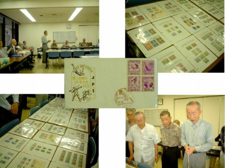 今日は、午前中は回生病院へ胃カメラを撮りに行き、途中大阪中央郵便局に寄り今日発売のアニメ切手と国土緑化の切手を買い、午後は島之内の中央開館で行われた郵趣サロンの会合に参加した。胃カメラの結果は、胃炎性糜爛が見られるものの悪性なものではないとのことだったので安心した。切手は発行される度に惰性で買っているが、発行回数や種類が多い上、切手のデザインも落ちているのでそろそろいい切手だけに絞りたいと思っている。しかしそのいい切手の見極めが難しいのである。郵趣サロンでは3ヶ月に1回、マイコレクション拝見というのがあり、今日はMさんの世界のスポーツ切手だった。世界には300の国と地域があるがそのすべてで発行されたスポーツ関連切手を収集されている。今日は各国の一番切手(最初に発行されたスポーツ切手)を見せてもらった。例えば日本では1947年に発行されて第2回国民体育大会の切手。国によっては国技と言われるスポーツが一番切手であったり、フィリピンではアジア大会、ギリシャなどでは、オリンピック、ウルグワイではワールドカップが一番切手になっていて興味深い。しかし膨大な数のスポーツ切手を全部、未使用、使用済み、初日カバーと揃えて集めておられる執念と熱心さには驚いた。写真は、展示の説明をするMさんと展示品の一部。中央が第2回国体記念切手の初日カバー膨大な コレクション見る 夏至の午後コレクション拝見のあとは恒例の盆周しとなり、珍しい切手、カード、カバーなどを入手することができた。