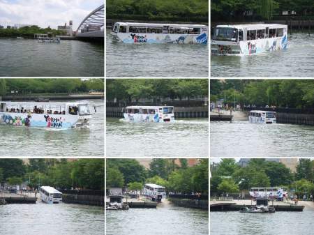 今日は、午前中は、テレビでNHK俳句や日曜美術館などを見たあと、大川へ水陸両用バスを見に行った。午後は昨日の写真の整理や読書などで過ごした。昨日の夕刊に、16日から営業を開始した水陸両用バスの記事が出ていたので、珍しいので見てみたいと思ったのである。バスは10時になんばパークスを出てので、11時くらいに桜の宮に来ると思っていたが、10時50分くらいから待って11時になってもバスの姿は見えなかった。近くにカメラを持った人が何人かいたので尋ねると既に10時40分頃に川に入り中之島の方へ下ったのでもうすぐ戻ってくるはずだとのこと。桜の宮橋の下で待っていると、11時20分、大川を上ってくるバスを見つけた。バスはOAPの前でUターンし、対岸のボート乗り場のところに作られた斜面へと近づいた。バスの中からは、「さあ、皆さん、ご一緒によいしょとかけ声をかけて下さい」という声とともに、「よいしょ、よいしょ」というかけ声が聞こえる。バスは見る間に斜面を登り、岸に上がった。このあと陸路を通り、なんばパークスに帰って行くのだ。写真は、水陸両用バスが陸に上がる模様。水陸の 両用バスや 夏の川水陸両用バスの運行は、日本で始めてのことで、今月30日まで毎日4便テスト運行されるそうだ。運賃は5800円とやや高目だが珍しい体験をしたい向きにはお勧めかも。