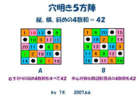 今日は、穴明き5方陣を考案し作ってみた。昨日まで、他の方陣の研究結果をまとめていたのだが、そのとき「穴明き5方陣」というものを思いついた。穴明き5方陣というのは、5×5のマスのうちの5個を穴とし、残る20個のマスに1から20の数を入れ、縦、横、斜めの4数の和がすべて等しくするようにしたものである。普通の4方陣は、16のマスの中に1から16の数を入れ、縦、横、斜めの4数の和がすべて34になるようにしたもので、解の数は880個ある。また、普通の5方陣は、25のマスの中に1から25の数を入れ、縦、横、斜めの4数の和がすべて65になるようにしたもので、解の数は275305224個ある。穴明き5方陣の個数は、その中間だから50万個くらいかと思われた。計算の結果、解は9492個存在することがわかり案外少ないことが分かった。そのうちから、面白い性質のものを2種紹介する。残念ながら、4方陣、5方陣のような完全方陣は存在しない。蟻の道 パズルの解の 数かぞふA,B,とも、縦5方向、横5方向、斜め2方向の4数和がすべて等しく42になることは同じであるが、Aについては、対角線以外の右下がりの不連続斜め4数和が4つとも等しくなっている。 19+3+6+14=42 13+17+5+7=42 12+20+2+8=42 9+11+18+4=42 また、Bについては、中心対称な4辺形の頂点の4数和がすべて等しくなっている。 1+15+16+10=42 6+14+5+17=42 20+3+11+8=42 19+7+12+4=42 2+13+18+9=42