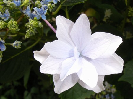 今日は、午前中までに、作成中だったパズル原稿を仕上げ、編集担当者に送付した。やれやれだ。しかし、午後も引き続き、執筆中に思いついたパズルの検討を行った。今日の画像は、額紫陽花。紫陽花のような小花の集合の回りを大きな花(修飾花という)6~8個が取り囲んでいる花で、それが額縁のように見えることから額紫陽花とか額の花と呼ばれている。普通は修飾花は薄紫色で一重のものが多いが、真白で八重のものは珍しいと思う。額の花 額縁ばかり 目立ちをり