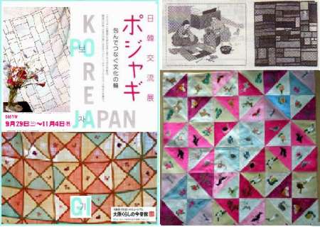 今日は、全国的に前日とはうって変って涼しい日になった。東京では最高気温が前日より11度低い18度とか。大阪でも前日より6度低い25度であった。朝からほとんどテレビを見て過ごした。午後、大阪くらしの今昔館で開催されている「ポジャギ」展を見に行った。ポジャギというのは、布を材料とした韓国の伝統的手工芸品。衣服の裁ち端や古着をほどいてきれいな部分をパッチワークのようにつないでいく方法で作るもので、材料は、絹から麻・木綿までいろいろ。用途は、タペストリーのように壁にかけたり、暖簾のように吊るしたり、風呂敷のように物を包んだりするほかいろいろな分野に使われる。特に暖簾は、重ね縫いされた部分が縁取りとなって独特の模様を作るのが美しい。展示品は、壁掛け、暖簾、風呂敷が多かったが、布団包み、衣類包み、ブックカバー、お膳覆い、腕巻き、巾着袋、ボトル包み、コテ板、針山、手提げ鞄、糸巻き、はさみ入れ、指ぬき、テーブルウェア、クッション、匙入れ、人形、枕、お手玉などが展示されていた。写真はパンフレットから。秋風に ポジャギの暖簾 揺れてをり