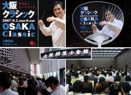 今日は、朝のうちテレビで、世界陸上女子マラソン、俳句王国、日曜美術館などを見たあと、今日から始まった「大阪クラシック」の開会イベントに参加した。世界陸上2007の最終日、遂に土佐礼子が銅メダルを取った。予選落ちが相次ぎ期待外れだった日本選手だったが、女子マラソンは最後まで目が離せない好レースとなった。暑い中、苦しさを乗り越えて感想した5人の選手にご苦労さまと言いたい。11時開演とのことだったので、少し早いとは思いながら10時過ぎに家を出て10時25分に会場である大阪弁護士会館(北浜の北西500M)に着いた。館内にはすでに長い列が出来ていて人気の大きさに驚く。定員は800人だが、600番目くらいだという。館内の行列はすぐに一杯になりその後の人は暑い屋外に並ばされている。10時40分から入場が始まり、順に2階のホールへ案内される。ちょうど私のところで、ここから後の方は立席になりますとのこと。立ち見を覚悟で入場したが、全くの幸運で、私の2,3人後の人まではうまく席に座れた。司会の人の話では、入場者が多かったので、後方の椅子を取り除いて、椅子600、立ち見600としたようだ。定刻の11時になってもまだ入場の列は続く。10分遅れての開始となった。大阪音楽大学管弦楽団との共演で50人以上の大楽団。コンサートは、ワーグナーの楽劇「ニュルンベルグのマイスタージンガー」第1幕への前奏曲で幕を開けた。1曲終り、総合プロデュースの大植英次氏が、ユーモアたっぷりの挨拶をする。1.沢山のお客さんに感謝。定員800人のところに1200人ほど入って貰ったので、消防法に違反するかも知れない。しかしここは弁護士会館。弁護士さんよろしくお願いします。2.大阪クラシックは副題に、「御堂筋にあふれる音楽を」とあるように御堂筋沿いの会場で演奏会が行われる。しかしここは御堂筋沿いではない。虚偽の広告と言われたならば、弁護士さん、なんとかお願いします。3.大阪フィルの提案にご協力いただいた関大阪市長にお礼の意味で、ネクタイをプレゼントしたい。これは、賄賂ではない。もし賄賂で告発されたなら、弁護士さんよろしくお願いします。続いての曲は、ブラームスの「ハンガリー舞曲」第5番。そして最後の曲は、スメタナの歌劇「売られた花嫁」三つのダンスより”道化師の踊り”。やはり生の演奏はいいものだと思った。指揮者の曲に陶酔しているような仕草を見ながら聴くのも、音楽を親しみ易くしてくれるように思った。演奏が終り、会場から長い拍手が続いたが、アンコール演奏はなかった。ファンの女性から、大植氏にバラの花束が贈られたが、彼はバラを一本一本抜いて、ゲスト出演のメンバーたちに配っていたのに感動した。この「大阪クラシック」は、昨年から始まったもので今年は2年目。弁護士会館を含め、御堂筋沿いの15の会場で、今日から8日までの7日間に60ステージが開催される。同時に別の場所で開催されることはないので、時間さえ許せば、全部を聴くことができる。殆どのところは無料だが有料のところもある(有料でも500円~1000円と安価)。スケジュールなどは、主催者のサイトを参照されたい。画像は、パンフレットより、配布された団扇、弁護士会館一階、2階ホール。秋風に 乗って大阪 クラシック