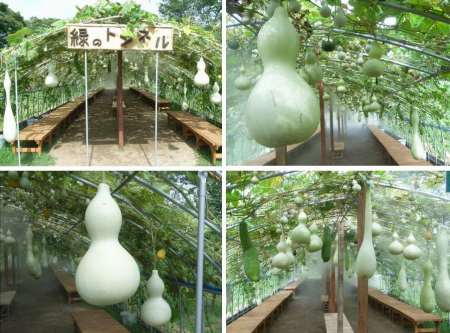 今日は、午前中、ゴルフバッグを宅配便に頼んだり、テレビで俳句王国を見たり、YouTubeから動画を録画したり、切手やパズルの雑誌を読んだりしながら一日が過ぎた。夜、世界陸上で朝原らの日本チームが400メートルリレーで5位入賞を果したのが感動的だった。YouTubeからの動画収集は、随分貯まった。懐かしいテレビの番組、懐かしい昔の歌、懐かしい映画、落語、ジブリ作品、バンド、からくり、オルゴール、自動演奏楽器、素人が演奏するクラシックなどなど。キャンディーズの曲は26曲、ジブリ作品は16曲ダウンロードできた。枝雀の落語は何とも言えない味がある。ヴァイオリン、ギター、ウクレレなどいろいろな楽器によるトルコ行進曲も聴いた。今日の画像は、昨日、長居公園で撮った"緑のトンネル"。瓢箪や糸瓜などが今沢山の見事な実を結んでいる。トンネルは長さ30メートルくらいあり、中にはベンチも置かれ休憩できるようになっている。室内を冷すため水が噴霧されていて外より涼しい。瓢箪の 形大きさ 見飽きせず