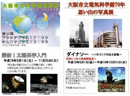 今日は、朝は俳句を考えたりしながら、昼前から久しぶりに中之島の市立科学館へ行った。11時前に入り、12時まで展示の見学、12時からプラネタリウム、13時からオムニバス映画を見て2時までを過ごした。展示では、電気科学館70周年回顧の写真展をやっていた。四ツ橋時代に何度か行ったことがあるので懐かしかった。他の展示類も科学実験装置も主な対象は子供向けのようだが、ケプラーの法則、連鎖反応、偏向板など大人でも十分楽しめるものがあった。プラネタリウムでは、大阪の現在の星空を星座と関連付けて説明を聞いた。その後、太陽系の話があり、冥王星が惑星から外されたあとの太陽系の構造の説明を聞いた。オムニバス映画は「ダイナソー」という題の世界最大の恐竜の映画で、視界全部が映像に包まれるような大画面でもの凄い迫力だった。このような迫真的な映画はどうやって撮るのだろうかと不思議だった。星月夜 大阪の空 明る過ぎ帰宅後は、ほろよい句会の整理などをしていると、ほどなくプロ野球が始まった。各試合追いつ追われつの好ゲームだったが、結局、阪神は中日に破れ、巨人は広島に奇跡的な逆転勝ちをした。3チームが0.5ゲームの混戦状態となり、阪神の優勝確率は43%に下った。