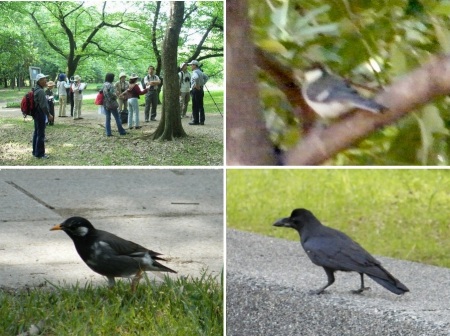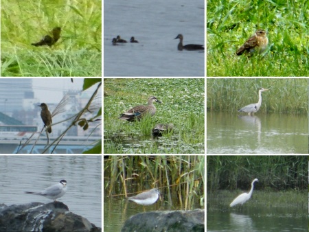 今日は淀川探鳥会の日。昨夜来の雨がまだ完全には止んでいなかったが、雨の峠は越えているとのことで参加した。この探鳥会は雨天決行なのだがひどい雨のときは中止になることもある。雨天のため参加者は少なかったがスタッフの方は全員参加で、5人の先生に囲まれた贅沢な探鳥会となった。今日も多くの鳥を見ることができた。水鳥は少なくなったが、ヒバリ、コアジサシ、オオヨシキリ、キアシシギ、セッカなどが多く見られた。オオヨシキリの声とセッカの声とはひっきりなしに聞こえていた。写真は、カワラヒワ、カルガモ、ヒバリ、オオヨシキリ、カルガモ、アオサギ、コアジサシ、キアシシギ、ダイサギ。絶え間なく 葦切の鳴く 淀堤コアジサシは空中から真直ぐに水面に降りて(落ちて)餌をとるのが特徴で今日はコアジサシのジャンプを何十回となく見ることができた。ヒバリが草叢に下りているのも初めて見た。前出の他、今日見た鳥は次の通り。カイツブリ、カンムリカイツブリ、カワウ、ササゴイ、コサギ、マガモ、キンクロハジロ、ケリ、トウネン、アオアシシギ、キジバト、ヒヨドリ、ウグイス、ムクドリ、スズメ、ハシボソガラス、ハシブトガラス、ハッカチョウ。28種。