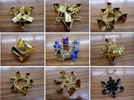 今日は句会の日。午前中は出句する5句の選定と最後の推敲を行った。成績はまずまずだった。先生からは1句が選ばれ、仲間からは3句が選ばれた。残り1句は誰からも選ばれなかった。最後に手直ししたのが悪かったようだ。先生から選ばれたのは次の句。 菖蒲湯に 世情の憂さを 忘れをり仲間から選ばれたのは次の句。 石舞台 茅花流しの 中にあり (5票) 夏燕 空家留守宅 わきまへて (3票) 薪能 面も衣裳も ゆらめいて (2票)誰からも選ばれなかったのは次の句。 牡丹園 見頃を過ぎし 花は無視 これは、はじめ、 牡丹園 見頃を過ぎし 花もありとしていたのだが、少し強めようのして悪くしてしまったようだ。今日の先生の特選句は次の通り。 ◎母の日や 母を呼ぶ子と 呼べぬ子と 功次 ◎ビル街を 知り尽したる 夏燕 初枝 ◎菖蒲湯に 湯の香草の香 あふれけり 可奈子今日最高点を得た句は、先生の句。 菖蒲湯に 吾が体重を 沈めたる 塩川雄三先生 (7票)生徒では次の句が最高得票だった。 薄紙の 剥がるるやうに 牡丹散る 可奈子(5票)今日は、先生と可奈子さんが大量得票したため、他の生徒にはあまり票が回らなかった。句会のあとは恒例の反省会となった。いつもは記念写真を撮っているのに、今日は「店内での写真撮影はお断りします」という張り紙が目にとまったため、写真は撮らなかった。今日の写真は、昨日、パズルの会でTUさんから紹介された「クリップアート」。普通クリップアートと言えば、挿絵用などに用意された絵画のこと。パソコンのWORDでもお馴染のことばだが、ここでは違う。文房具のクリップでアートを作るのだ。TUさんは大量のクリップを買い込み100種類にも及ぶいろいろな形をクリップだけで作り出した。その簡単な例を次に示す。夏の宵 クリップアート 挑戦す簡単に作れそうだが、どれ一つとして簡単に作れるものはない。