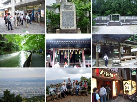 今日は、旧PIPクラブの仲間と、山科・醍醐ハイキングを行った。当初は上醍醐登山だけが予定されていたが、雨が心配されたため、山科散策に切り替え、昼食までを過ごし、昼食を済ませたあと雨が止んだため、上醍醐登山を実施することにしたので、歩く距離は当初の倍近くの3万余歩となった。かなり疲れたが、最後の飲み会を含めて楽しい一日を過ごすことができた。朝9時に自宅を出、JR大阪駅発9時25分の快速に乗り、10時10分に山科に着いた。参加予定者はほぼ集まっていたが、S氏だけが見えない。携帯で確認すると、雨天が予想されるため待ち合わせ場所を変更したのを知らずに醍醐駅で待っているとのこと。すぐに山科まで来てもらった。10時45分、参加者16名が揃い、地下鉄で御陵へ。今日の案内役は地元のAさん。御陵で降りてパンフレットを貰い、散策スタート。まずは天智天皇陵を見て、疎水沿いに東に進み、安朱橋を渡り北進し毘沙門堂に向う。地下鉄を降りて歩き始めた頃から小雨が降り始めたが大した雨ではなく反って新緑を美しく見せてくれている。疎水沿いの散策も快適だった。毘沙門堂にお参りしたあと山門の下で弁当を広げる。Sさんから頂いた虎杖の煮物は美味しかった。13時午後の行動開始。雨が止んだので、山科散策は打ち切り、当初計画通り上醍醐登山を実施することに決まる。山科まで引き返して地下鉄に乗り醍醐駅に着いたのはちょうど2時。2年前の私の体験では登り1・5時間、頂上滞在30分、帰り1時間だったが、今日のメンバーでは往復4時間くらいにかかるだろうと予想を立てて、登山開始。2時47分に10丁目、中間地点の滝のある休憩所に到着。10分休憩して再び登山。20丁の准胝堂には3時34分に到着した。さらに山頂には3時48分に着いた。ここで記念写真を撮ったり、京都・大阪の眺望を眺めたりしながら休憩し、4時12分に下山を開始した。途中、膝が痛くなったりしてゆっくりする人も多く休憩時間も長目となったが、それでも醍醐駅には全員無事に6時に帰着した。再び地下鉄に乗り、予定のあるTさんだけを山科駅で見送り、残り15人は最後の目的地である飲み屋「八剣伝」に腰を下した。宴は盛り上がり、あっという間に9時。次回11月22日の再会を約してそれぞれ帰路に着いた。私はNさん、Hさん、Sさんとともに9時23分の新快速に乗り9時58分に大阪に着き、タクシーで10時10分に自宅に帰りついた。楽しい一日だった。本当に「この会はなんでこんなに盛り上がる」のだろう。画像は、山科駅での待ち合わせの様子、天智天皇陵前の日時計、天智天皇陵、疎水沿いの散策、毘沙門堂、准胝堂、醍醐山山頂からの眺望、山頂での記念写真、飲み会。新緑の 琵琶湖疏水路 傘の列