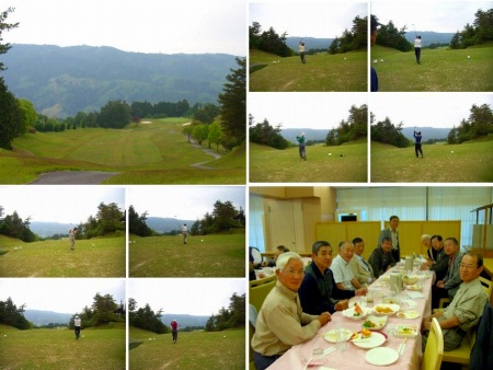 今日は、朝4時半に起きて同期会のゴルフコンペに参加した。ゴルフは下手で車もないので参加は諦めていたが、親睦が目的ということと途中の駅からピックアップしてもらえるというので参加した。5時49分大阪天満宮発の電車に乗り、松井山手に6時半に着いた。ここでTさんの車に乗せてもらい名張にあるゴルフ場に8時過ぎに着いた。同期40数名のうち11名が参加した。コンペは第1回ということで、ダブルペリア方式で行われ私の成績はBBだった。心配された雨は競技中は降らず、暑くも寒くもない絶好のお天気の中でプレーを楽しむことができた。雨はプレーが終るの待ったようにして降りはじめた。このコンベは今後幹事持ち回りで年に2回のペースで行うことが決まった。写真は、スタートホールとティーショットをするプレーヤー、パーティの模様など。次ホールへ 向ふカートや 若葉風パーティは4時過ぎに終わり、再び松井山手まで送ってもらい、大阪天満宮駅には6時40分に帰着した。