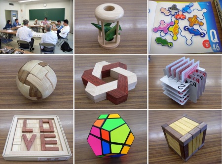 今日は、午前中は、テレビでNHK俳句、日曜美術館などを見たあと、午後は、関西ぱずる会の例会に参加した。会員各自が考案・作成したパズル・数芸、収集・入手したパズル類・書籍・資料、パズル情報などを報告しあい、パズル解き競争などもあって楽しい時間を過ごした。私は、関孝和の展示会案内とカタログ、マカオの数学切手、内田氏の包括方陣、自作の対称星陣などを発表した。今日、回覧・紹介されたパズル類は約100種。市販のものもあるが木製の手作りも多い。パズルはやはりプラスティック製より木製、金属製が重量感があって好きだ。写真は、例会風景と回覧されたパズル類の一部。 風薫る 常連揃ふ パズル会
