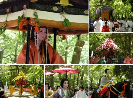 今日は京都3大祭のひとつ葵祭の日、下鴨神社の有料観覧席で見物した。天満橋を9時33分の京阪特急に乗り出町柳に10時30分に着いた。駅からは葵祭を見る人たちの行列が続く。神社にいたる沿道には早くも場所を確保して坐り込んでいる人が並んでいる。境内に入ると有料観覧席が道の右側に200メートルほどにわたって設えられていた。混雑が予想され、遅くなると観覧席にたどり着けなくなる恐れがあるのでなるべく早く来て着席するようにと券に書いてあったので、早目に来たが、祭の行列の到着にはまだ1時間近くある。それでも席は半分以上埋まっていて、配布されたパンフレットなどを熱心に読んでいる。行列(正式には路頭の儀という)は御所を10時30分に出発して丸太町通、河原町通を経て下鴨神社に向う。いろいろな資料を読んだり周囲の様子を見ながら待っているとやがて最初の行列が到着した。11時45分だった。行列は本列と斎王列からなり、本列は、検非遺使などの第一列、牛車などの第2列、舞人などの第3列、陪従などの第4列からなり、いろいろな役目の人で構成されている。総勢511名、馬36頭、牛4頭、牛車2基とパンフレットには書かれていた。見ものはやはり斎王列だ。華やかな十二単に着飾った女官が大勢通り過ぎる。それぞれの着物の模様も違っていて面白い。今年の斎王代は村田紫帆さんという人だそうだ。稚児たちも可愛い。行列はクライマックスに達するとすぐ終わりとなった。この間30分足らずだった。行列の写真は80枚くらい撮ったがその中から数枚を次に示す。斎王代、牛車、風流傘、風流傘、命婦、騎女。賀茂祭の 斎王代の 無表情行列は下鴨神社で社頭の儀を執り行ったあと、2時20分に再出発して上賀茂神社に向う予定だ。社頭の儀とは、勅使が御幣物を奉奠し、御祭文の奉上のあと、牽馬・舞人の東遊びなどが行われる。この神事も拝観料5000円を払えば見ることができるそうだ。社頭の儀が行われている間、下鴨神社では、1時30分から流鏑馬の道で走場の儀や舞殿で狂言などが披露される。持参した弁当を境内「奈良の小川」のほとりで食べ、糺の森、御手洗川、反橋などを散策していると1時半となり、走馬の儀や狂言などをみた。写真は、社頭の儀のため本殿に入る行列、走馬の儀の神事、走馬の様子、狂言「ぶす」の奉納演技。賀茂祭の 馬も豪華な 飾り付けそのうち行列が上賀茂神社へ出発する時刻が近づいたので、急いで下鴨本通の方に向った。ちょうど、行列が通りに出てくるところに場所を決め、沿道でもう一度見た。やはり有料観覧席でゆっくり見るのとは大違い、押し合いへし合いされながらの上、警官が警備員が動きまわるので、シャッターチャンスを逃すことが多く、撮影は困難だった。また、境内での行列と違い、午後の行列は心なしかダレ気味のように感じた。2時50分に最後の列を見て、帰路に着いた。ふたたび下鴨神社の境内を抜け出町柳3時10分の特急に乗り4時過ぎに天満橋に着いた。なお、当日の写真39枚をこちらのサイトに投稿して掲載してもらいましたので、ご覧いただければ幸いです。