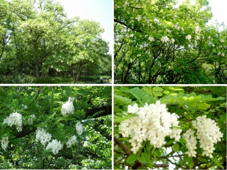 今日は、午前中はNHKのドラマ「ちりとてちん」の総集編を見て、午後は、NHKハイビジョンの「昭和の歌」を聞きながら過ごした。爽やかなお天気で絶好の外出日和だったが、世間では連休最終日ということでどこも混雑しているだろうと思い、雑誌を読んだり、パズル(包括7方陣)のまとめをしたり、在宅で過ごした。今日の画像は、一昨日、長居植物園で見たアカシアの花。園内のあちこちでフジに似た房の白い花が咲いていたが、何という名の花か分らず、写生をしていた人の何人か訊いてみたが、誰も知らなかった。帰宅後、図鑑で調べてアカシアの花だと分った。正式名はハリエンジュというそうだ。同じような形の花で黄色い花を付けるのは、ミモザ(ギンヨウアカシア)でこれはよく庭に植えられているので見かけることが多い。高さ15~20メートルくらいの大木(左上の写真の右下に人物が小さく写っている)になっている。アカシヤの 大樹に白き 花の房