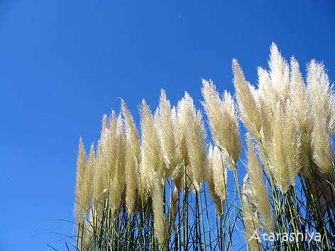写真はちっちゃい園の入り口に植えてあるパンパスグラス、9月になると律儀に穂を出します。