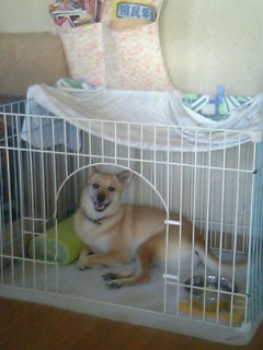 暑いあまりに居場所を探し、滅多に入らないゲージに納まった・・