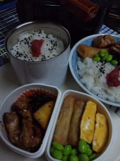 ☆冷凍食品色々(ひじき煮・春巻き・枝豆さやから出しただけ・大学芋)