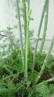 アスパラとミニトマトとキュウリ。 なかなかトマトが赤くならん。 この後、この華奢なアスパラはチンされて長女に食されました。