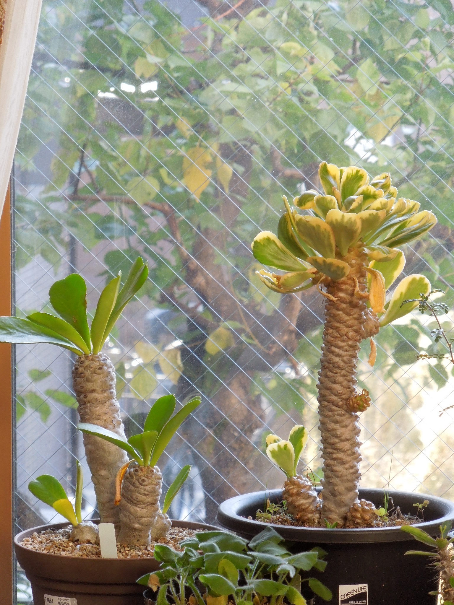 屋外に出しっぱなしだったオペルクリカリア・デカリー。葉の色が変わり始めたようなので屋内に取り込み。左の2鉢は2017年に実生した苗。左から3番目の苗は2016年に輸入した苗。右端は・・・今年、近所の趣味家さんとギラウミニアナと交換した根挿し苗。まだ、葉が緑色の苗も有るが・・・面倒なのでまとめて取り込み。実生苗は7年経って・・・幹の太さは、やっと1cmくらい。日が当たる窓際に取り込み。