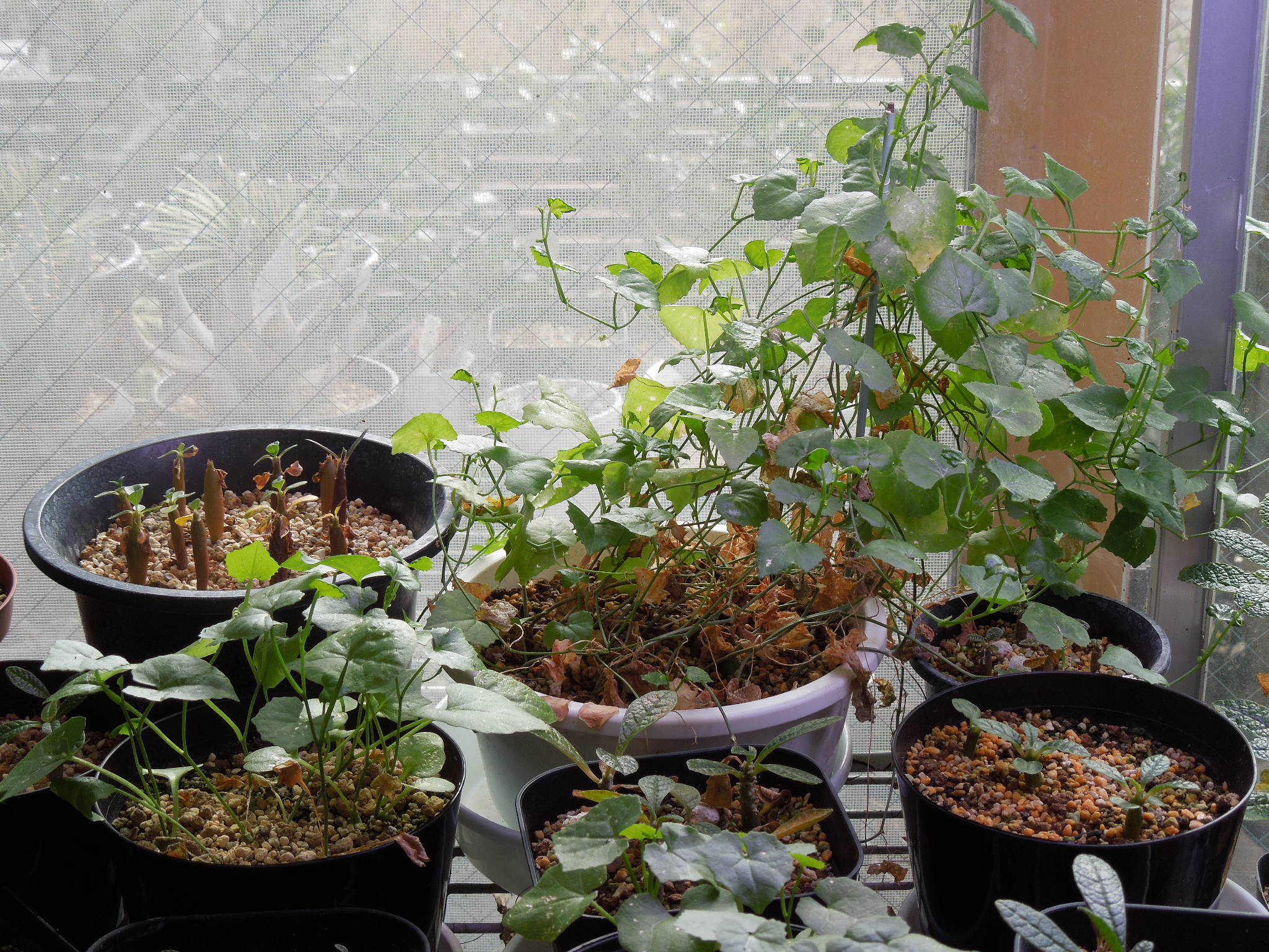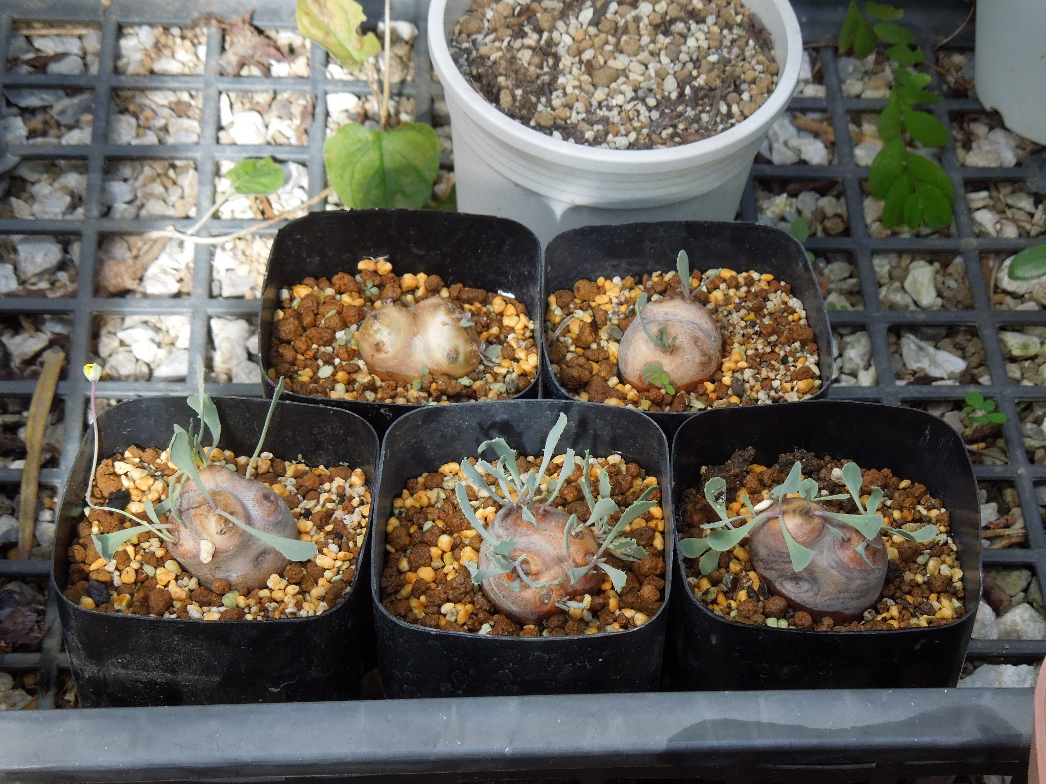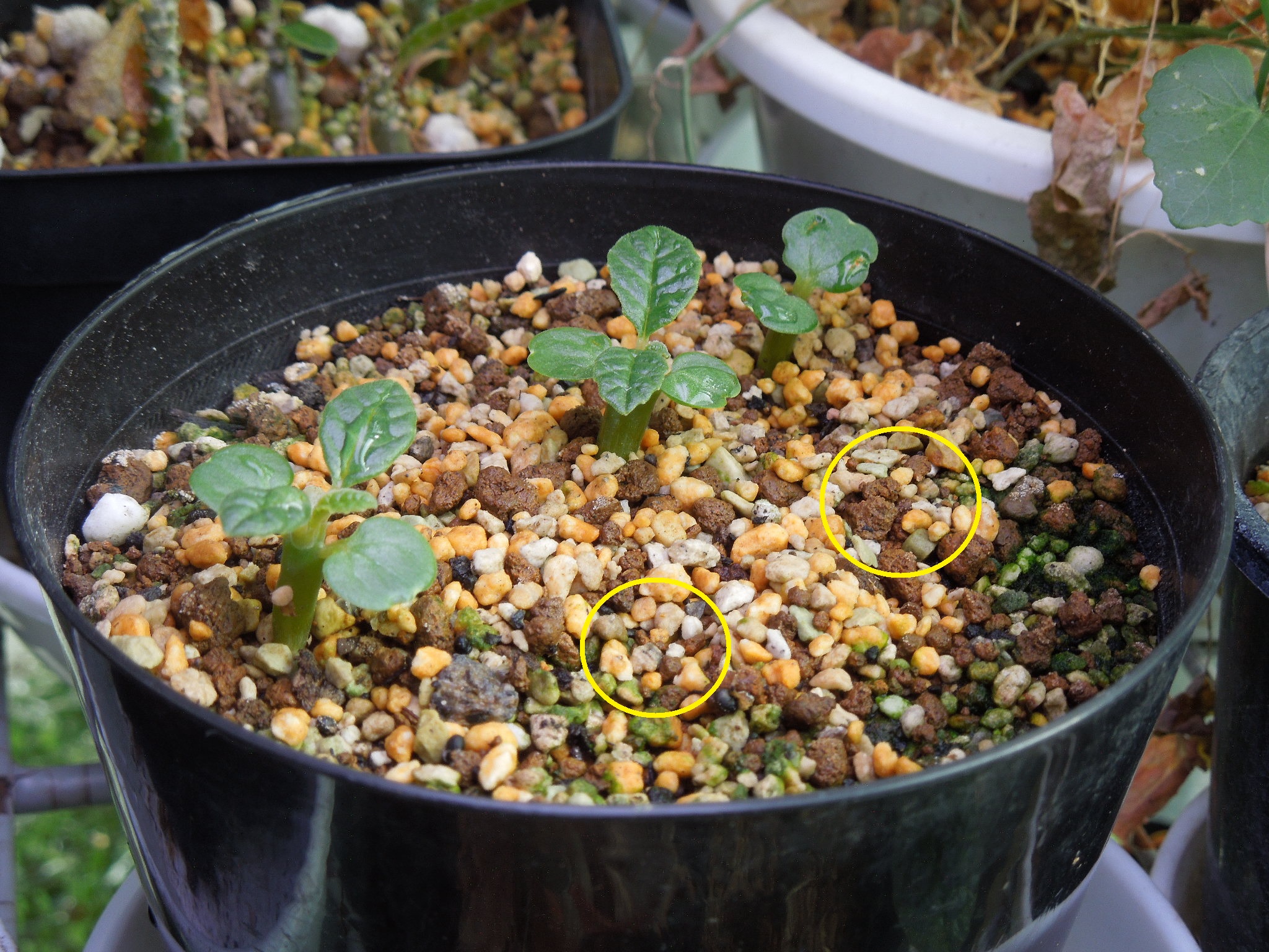 今年、初めて種が採れたイベルビレア・テヌイセクタ。9月に採り蒔き。だいぶ育った。いくつかは塊茎部が見えてきた。屋内用温室に置いてあるからか、まだ生長しているみたいだ。先日、蒔き忘れていた種を発見。蒔いてみたが・・・気温が下がっているからか、9月に蒔いた時より発芽までに日数が掛かっている。やっと発芽開始。