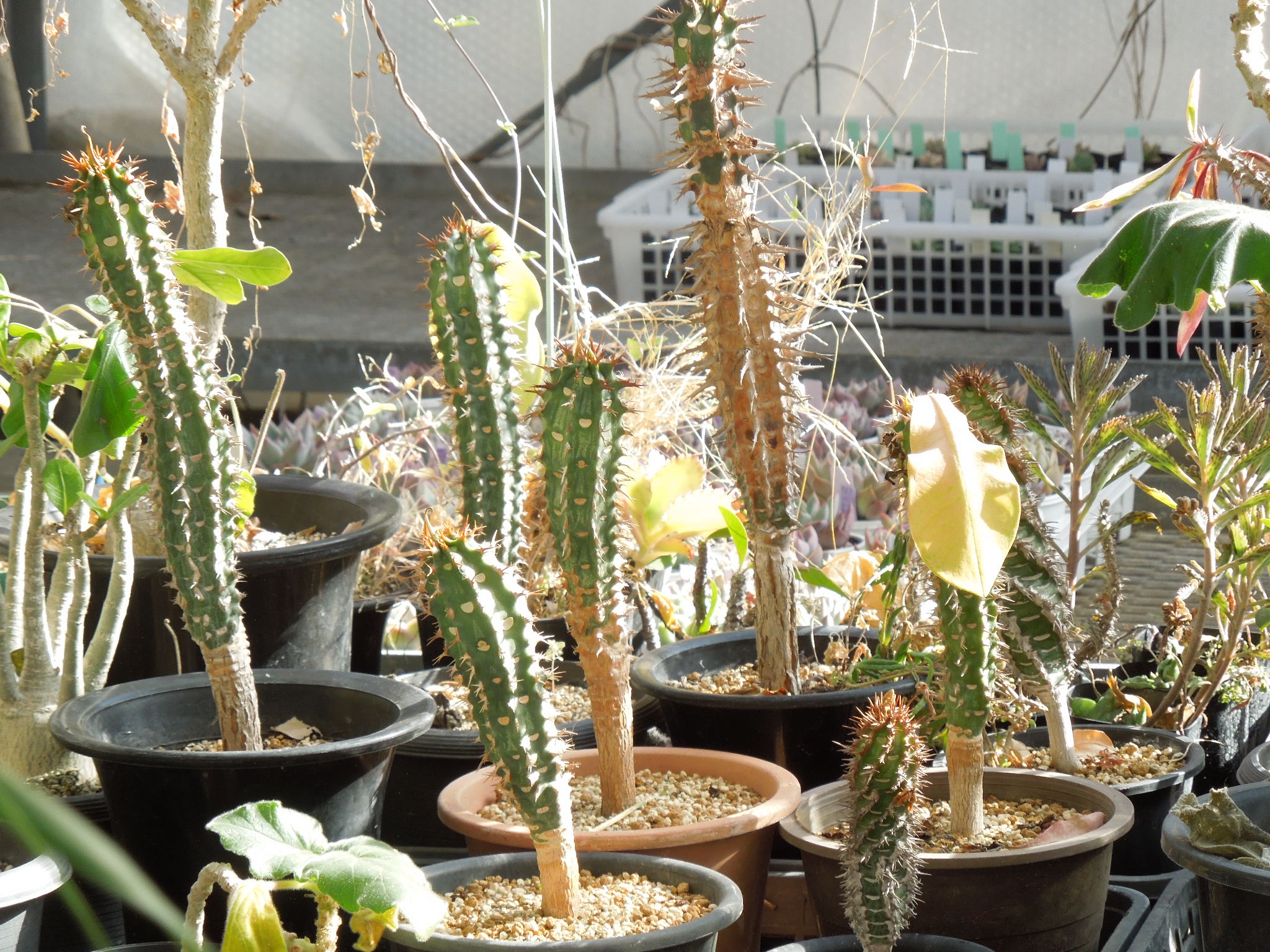 ユーフォルビア・ビグエリー、葉が落ちて幹がよく見えるようになった。刺の強さや、生え方が良く分かる。これが普通の刺???強めの1本の刺に細かい刺螺旋状に生える刺上のビグエリーとは反対方向の螺旋。自宅に置いてある交雑種???寒さに少し強いのか、まだ葉が残っている。花は白色。刺と言うよりは、産毛???今年実生したビグエリーは・・・どんな刺を出すか???