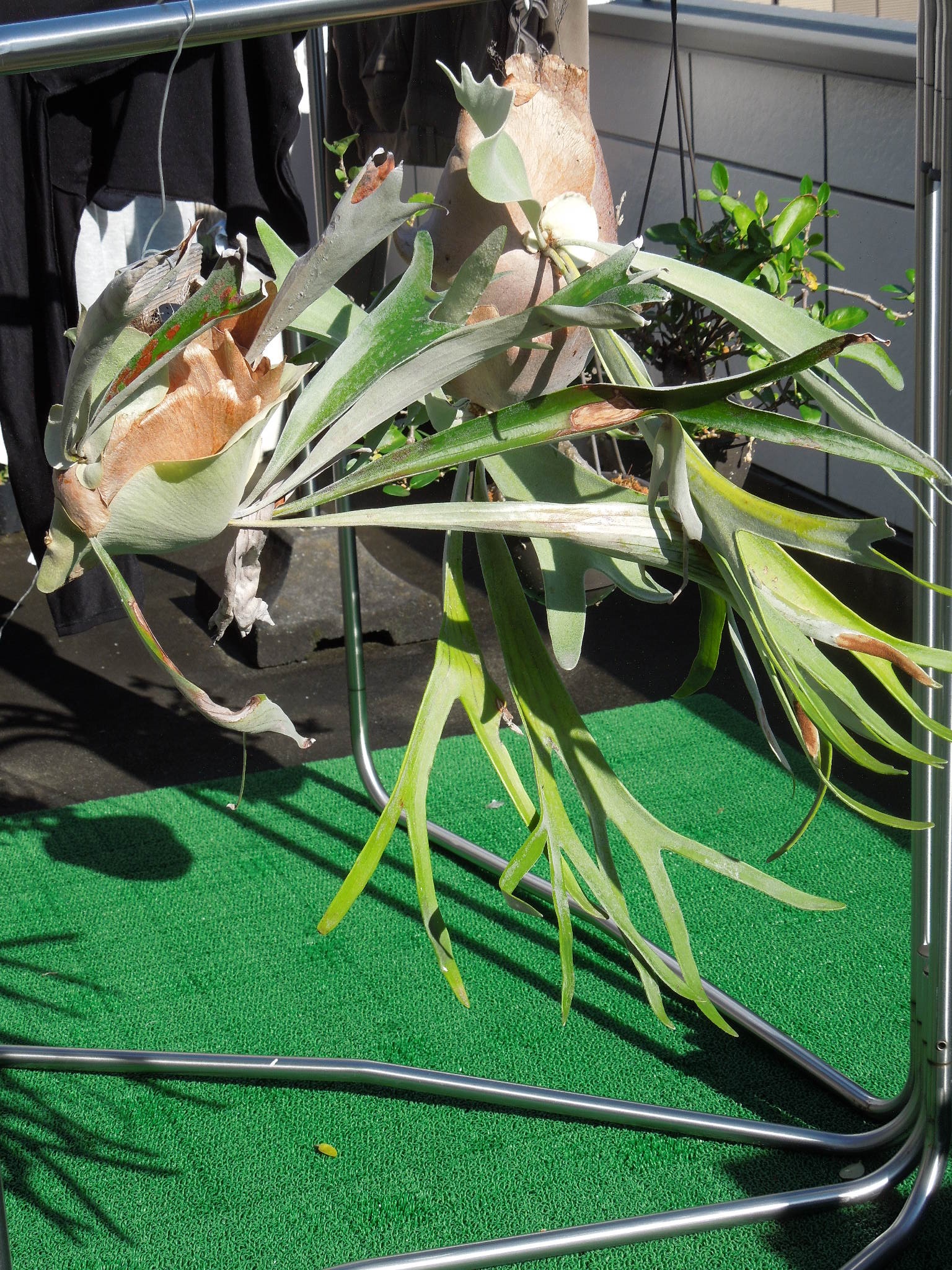 名前の通り青みがかった葉が気に入って購入したビカクシダ。栽培環境の違いか、購入時より色が変わったような気もするが・・・ブルーボーイ(手前)、ビーチー”レモイネイ”(奥)購入時の板に付いたままだが・・・子株が増えて・・・側面とか・・・裏側にまで・・・ビフルカツムの系統ということで、強健???親株も新しい貯水葉を展開中。