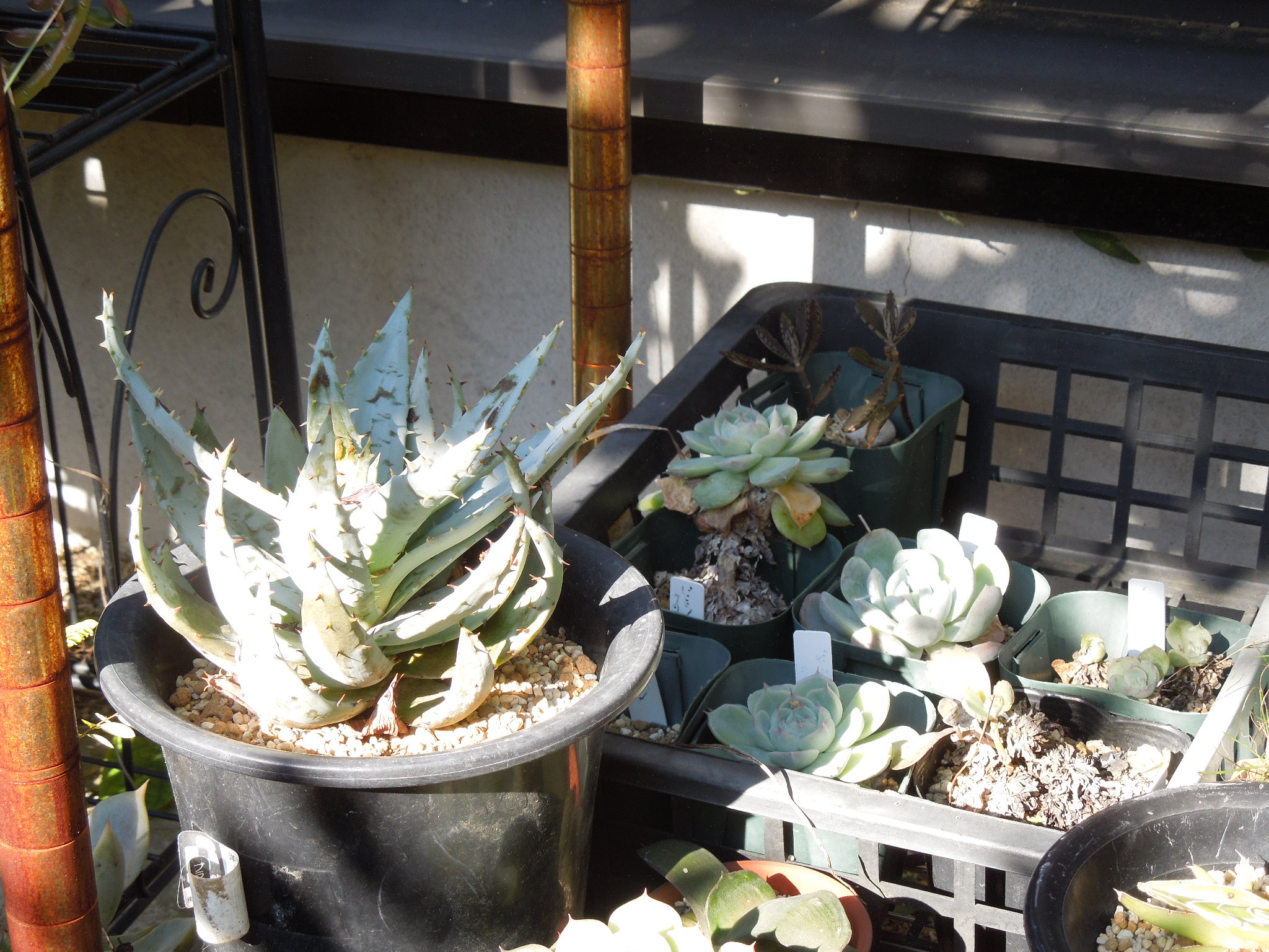 夏の間、ずっと玄関先軒下に放置状態だったカスティロニアエ×リザードブルー。3株とも寒さか水切れか、葉が巻いて萎れ気味。子株は更に酷い状態。もう1株も・・・とりあえず、1株だけ潅水。翌日には復活していた。ということで、残りの2株にもタップリ潅水。木洩れ日が当たるくらいの場所に移動。 (奥は、アロエ・パルブラ)来春には株分けして増やせるようにしたい。